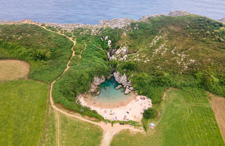La Playa de Gulpiyuri es conocida por ser un “tesoro escondido”, ya que no se encuentra directamente en la costa, sino a pocos metros del mar, conectada a él mediante un sistema de túneles subterráneos que permiten que el agua llegue hasta la arena. Esta particularidad geológica convierte a Gulpiyuri en un fenómeno natural único, donde las olas rompen en un espacio casi cerrado, creando un ambiente mágico y casi surrealista. Sus aguas son tranquilas, limpias y cristalinas, perfectas para quienes buscan bañarse sin la presión de grandes oleajes y con la seguridad de un entorno protegido.
